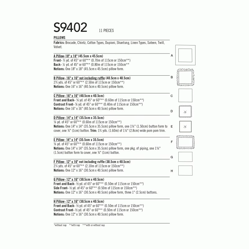 Simplicity Sewing Pattern S9402 Easy Cushions Different Sizes and Trims