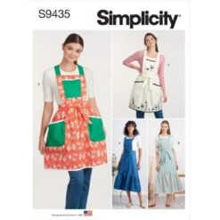 Pretty aprons have overall-style bib, waistband, crisscross shoulder straps and wraparound skirts for full coverage. Skirts come in mid calf length, ruffled with or without lace trim, or above knee length with hem and pocket binding and border print option. Variations include roomy pockets, carpenter loop and room for fabric mixing. Easy to sew.