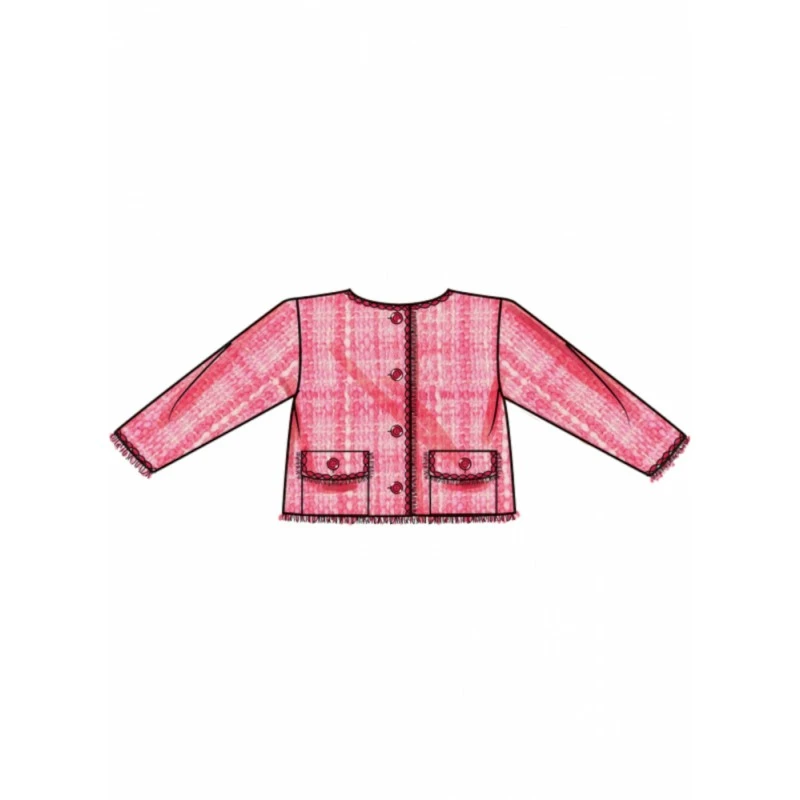 Stylish jackets, skirt and shorts feature decorative wide braid trim or fringed edges. Lined jackets have button closure and front pockets. Pull-on skirt and shorts have elastic waistband and side seam pockets.