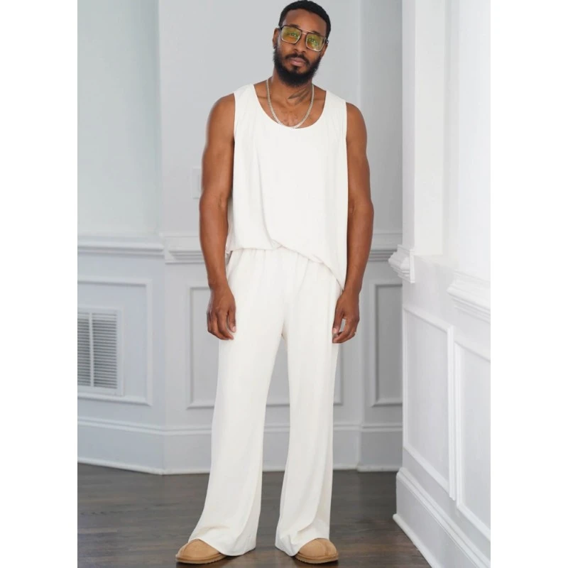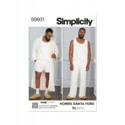 Easy to sew lounge set for Men. Pattern includes robe, tank top, trousers and shorts. Oversized fit robe has dropped shoulder sleeves and belt. Pull-on trousers and shorts have elastic waistband and side pockets. Sew Rating: Easy.