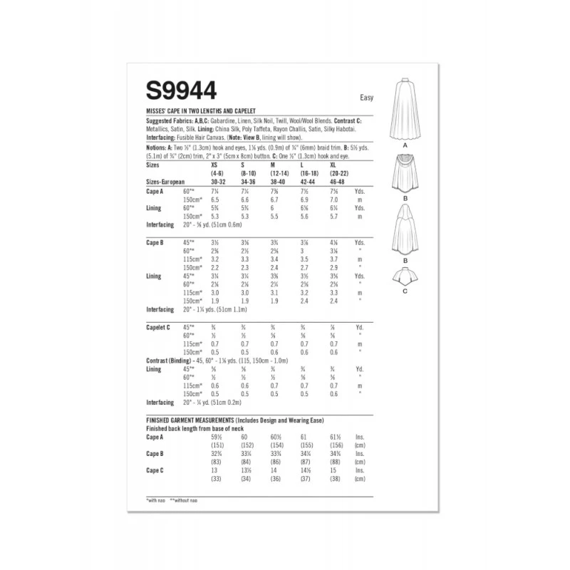 Interfacing: Fusible Hair Canvas. (Note: View B, lining will show).