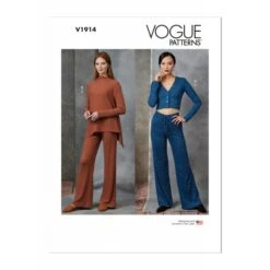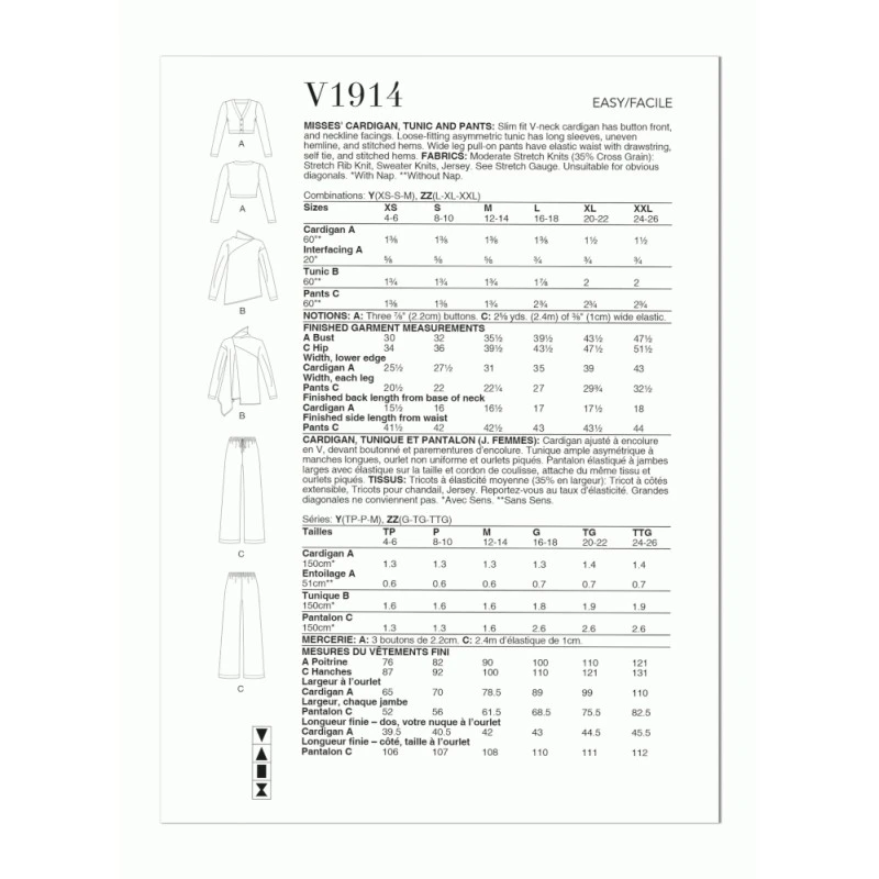 Slim fit V-neck cardigan with button front, and neckline facings. Loose-fitting asymmetric tunic has long sleeves, uneven hemline, and stitched hems. Wide leg pull-on trousers have elasticated waist with drawstring, self tie, and stitched hems. Sewing skill: Easy.