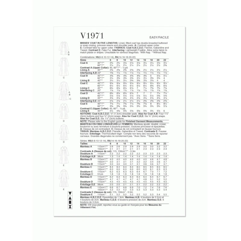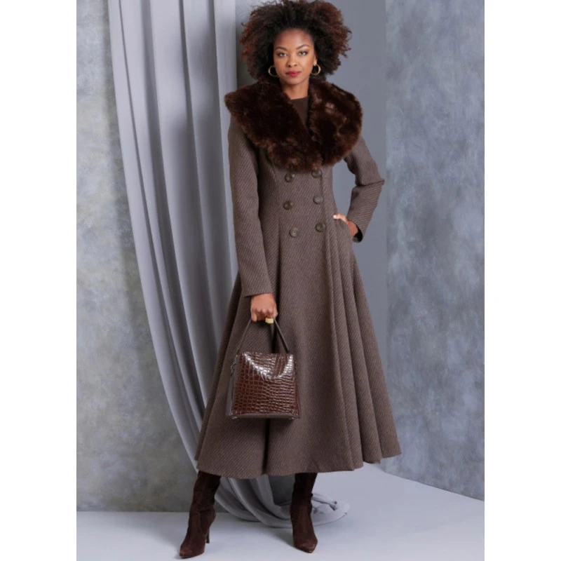 Lined, fitted coat has double-breasted buttoned or snap closing, princess seams and shoulder pads. View A: Contrast upper collar. View E: Contrast fake fur upper collar. Sew Rating: Easy.