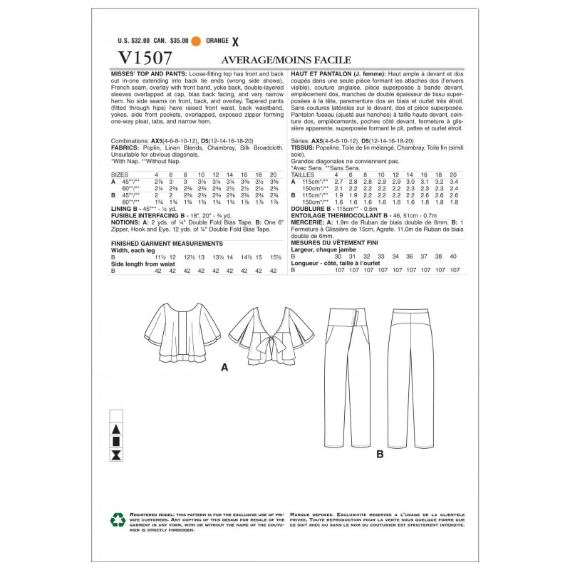Loose-fitting top has front and back cut in-one extending into back tie ends (wrong side shows), French seam, overlay with front band, yoke back, double-layered sleeves overlapped at cap, bias back facing, and very narrow hem. No side seams on front, back and overlay. Tapered pants (fitted through hips) have raised front waist, back waistband, yokes, side-front pockets, overlapped, exposed zipper forming one-way pleat, tabs, and narrow hem.
