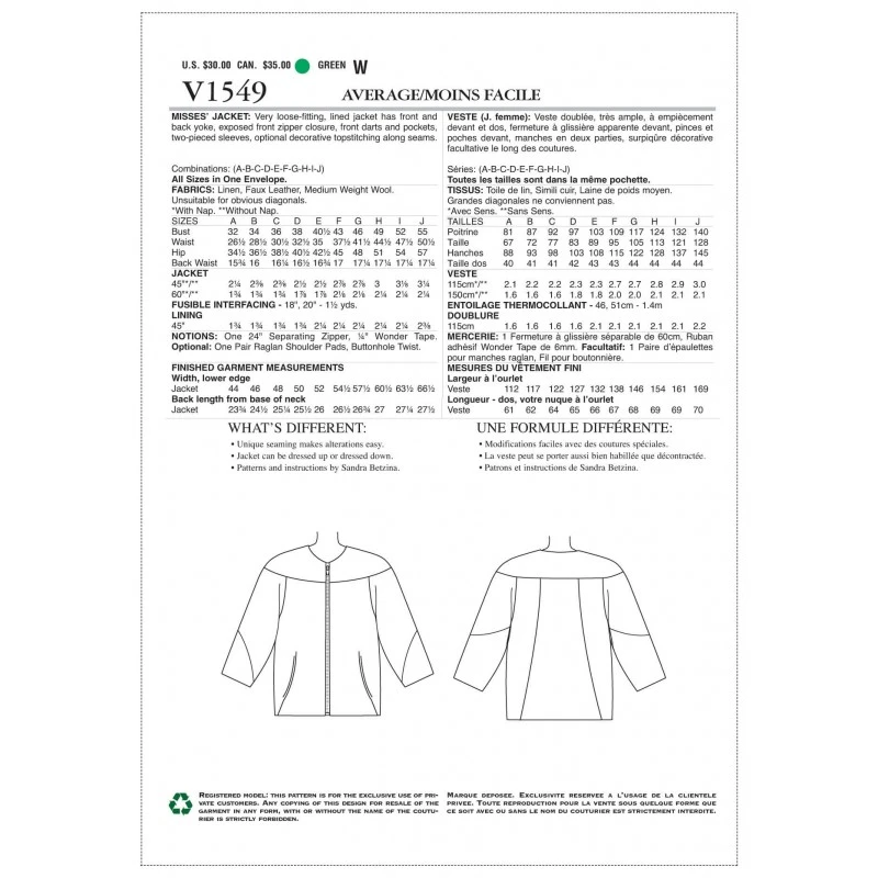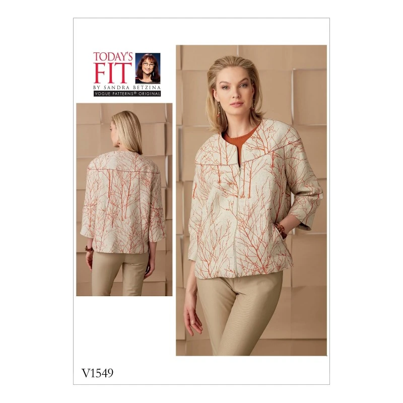 Very loose-fitting, lined jacket has front and back yoke, exposed front zipper closure, front darts and pockets, two-pieced sleeves, optional decorative topstitching along seams.