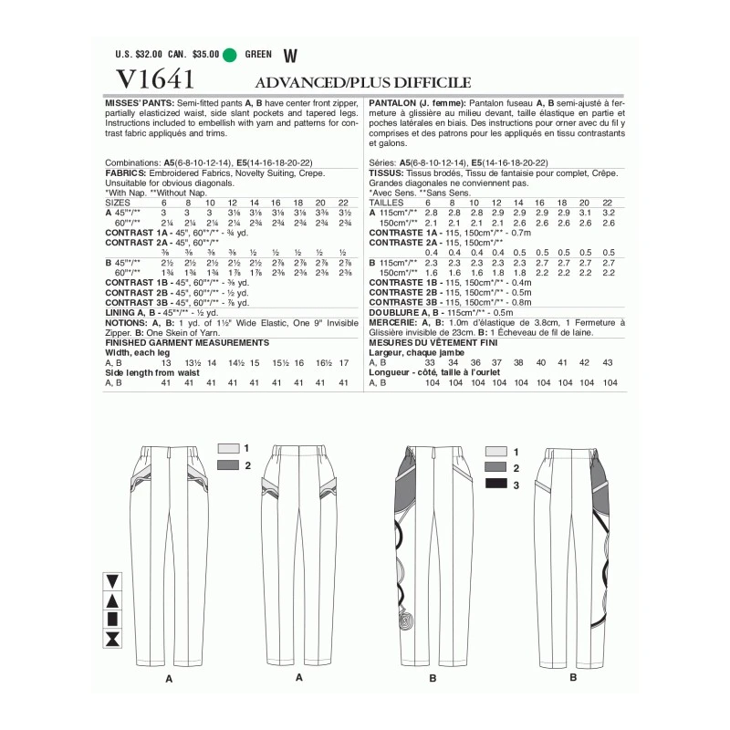 Semi-fitted trousers have center front zip, partially elasticized waist, side slant pockets and tapered legs. Instructions included to embellish with yarn and patterns for contrast fabric applique and trims. Sewing Rating: Advanced