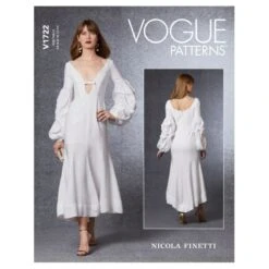 Dress is close-fitting, plunging neckline, self-lined bodice, partial lining on skirt, balloon sleeves.. Sew Rating: Average.