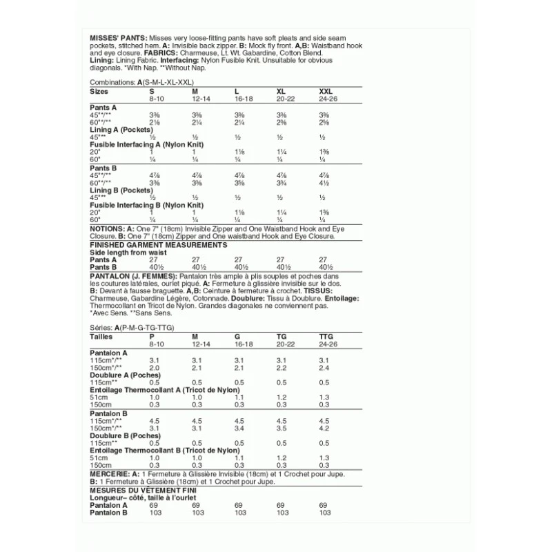 Misses’ very loose-fitting trousers have soft pleats & side seam pockets, stitched hem. A: invisible back zipper. B: mock fly front. A,b: waistband hook & eye closure. Sew Rating Easy