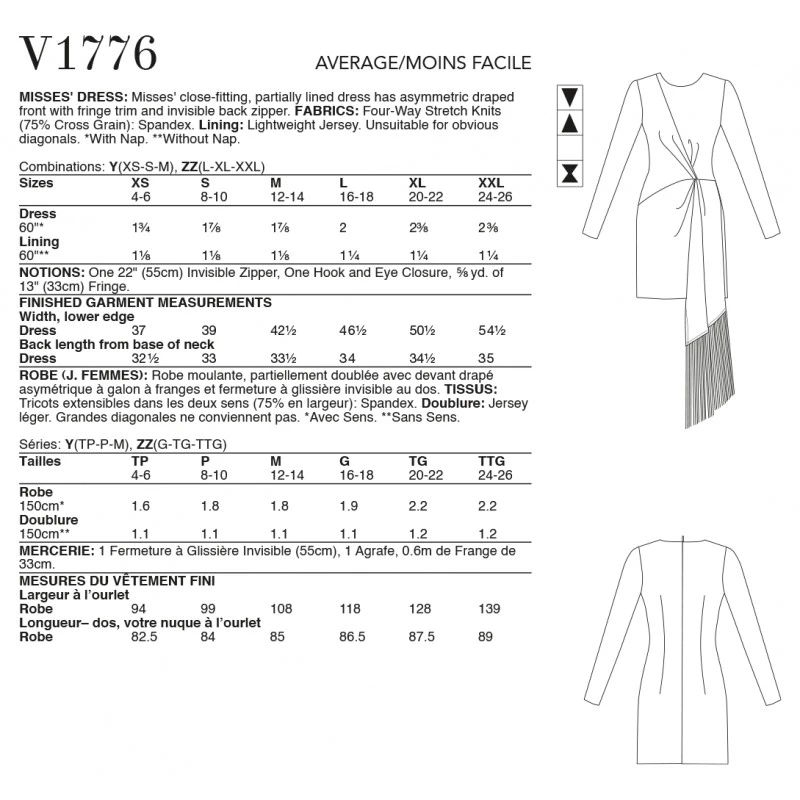 Vogue Sewing Pattern V1776 Misses’ Dress has Asymmetric Draped Front Back Zip