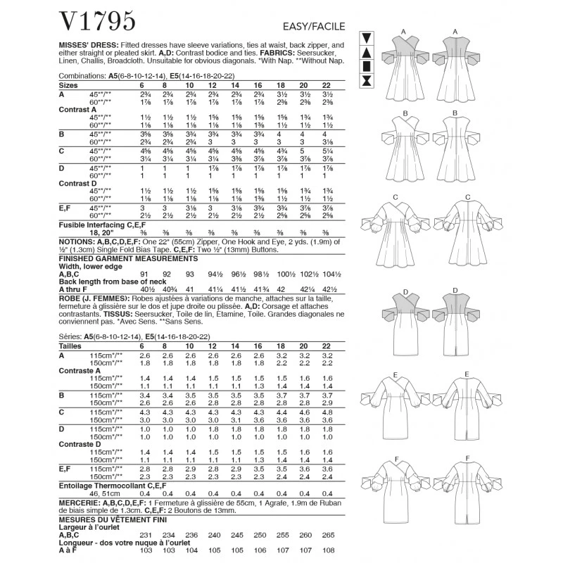 Misses’ fitted dresses have sleeve variations, ties at waist, back zip and either straight or pleated skirt. A, D: contrast bodice and ties.