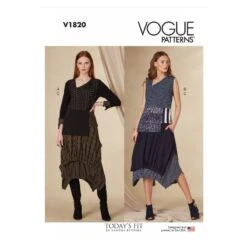 Top has asymmetrical neck, front and back overlays. A: set-in sleeves with cuff. B: sleeveless. Double layered skirt has elastic waist, ruched hem detail and side seam pockets. Sewing Skill Rating: Advanced.