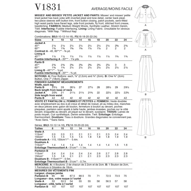 Misses’ and Misses’ Petite lined jacket has back yoke with inverted pleat and bow detail, center back pleat, two-piece sleeves with button trim, front button closing, patch pockets. Semi-fitted high waist trousers have flared legs, side-front pockets, fly front, stitched front crease, topstitching. Sewing Skill Rating: Average..