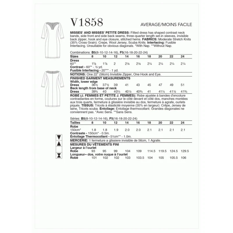 Tom & Linda Platt. Fitted dress has shaped contrast neck bands, side front and side back seams, three-quarter length set-in sleeves, invisible back zip, hook and eye closure, stitched hems. Sewing Skill Rating: Average.