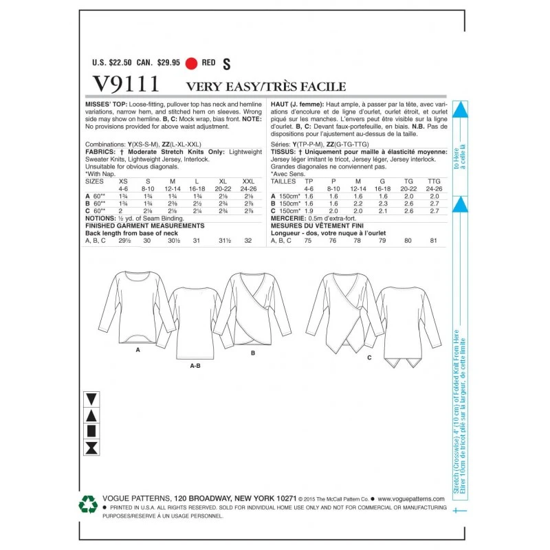 Loose-fitting, pullover top has neck and hemline variations, narrow hem, and stitched hem on sleeves. Wrong side may show on hemline. B and C: mock wrap, bias front. Note: no provisions provided for above waist adjustment. For moderate stretch knits only.