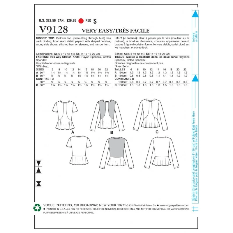 Pullover top (close-fitting through bust) has neck binding, front seam detail, peplum with shaped hemline, wrong side shows, stitched hem on sleeves, and narrow hem. For two-way stretch knits only.