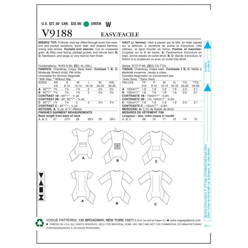 Pullover, bias top (fitted through bust) has neckline and patch pocket variations, lower side, and shaped handkerchief hemline, wrong side shows. Pockets and sleeves: Cut on crosswise grain. A: Bias neck facing, pleated pocket, short sleeves, and narrow hem. B, C: Neck band, elbow-length sleeves, and serge or very narrow hem finish. Contrast B, C: For moderate stretch knits only.