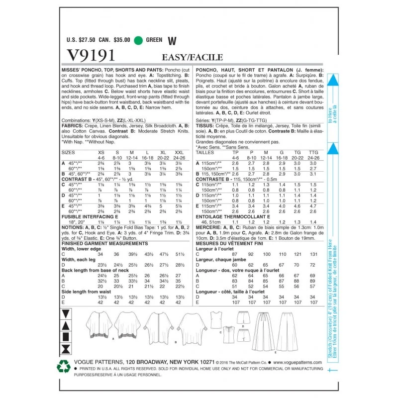 Poncho (cut on crosswise grain) has hook & eye. A: Topstitching. B: Cuffs. Sleeveless top (fitted through bust) has French darts, back neckline slit, back pleats, and hook/thread loop. Purchased trim A, bias tape to finish necklines, armholes C. Below-waist shorts have elastic waist and side pockets. Wide-leg, front-wrap trousers (fitted through hips) have back-button front waistband, back waistband with tie ends, and no side seams. A, B, C, D, E: Narrow hem. Contrast B: For moderate stretch knits only.