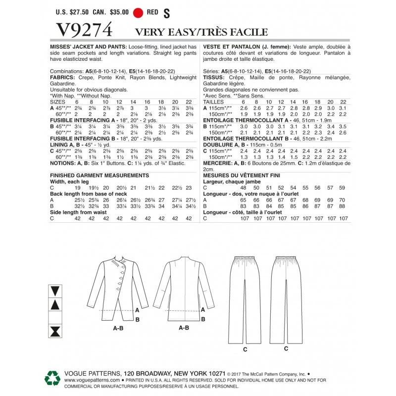 Loose-fitting lined jacket has side seam pockets and length variations. Straight leg trousers have elasticized waist.