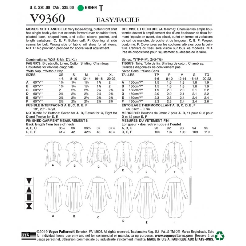 Very loose-fitting button front shirt has single back yoke that extends forward over shoulder front, pleated back, shaped hem, and collar, sleeve, pocket and length variations. C, E, F: Button cuff. F: Opening at side seams for belt. Wrong side of fabric will show for all views.
