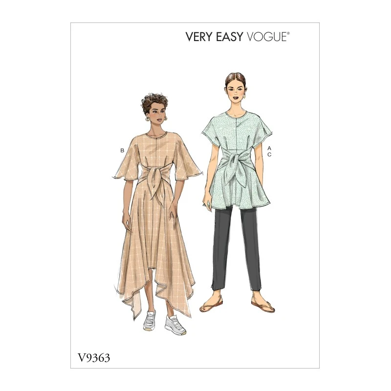 Tunic and dress are close-fitting through bust with back zipper, shaped waist seam, self ties at waist, and length and sleeve variations with purchased bias tape at neck. B: Shaped hem, wrong side of fabric will show.